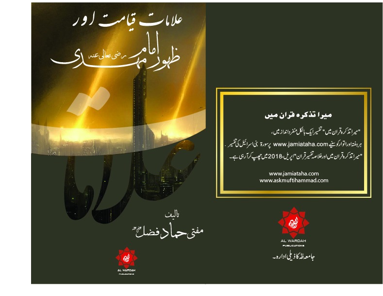 یہ کتاب مفتی حماد فضل صاحب کا علامات قیامت پر کیا گیا اہم بیان ھے ۔ جس میں احادیث کی روشنی میں امام مھدی رضی اللہ عنہ کے ظہور کی علامات کو بیان کیا گیا ھے اور بتایا گیا ھے کہ علامات قیامت میں سے کون ،کون سی علامت پوری ہو چکی ھے۔یہ بیان سے تحریری شکل میں لایا گیا ھے ۔ مولف: مفتی حماد فضل ۔ کل صفحات : 80 کلرڈ پرنٹنگ ۔بہترین کاغذ دیدہ زیب ٹائٹل قیمت =130 روپے . 40% ڈسکاونٹ کے بعد آپ کو یہ کتاب 65 روپے کی ملے گی ۔ علاوہ ڈاک خرچ ۔